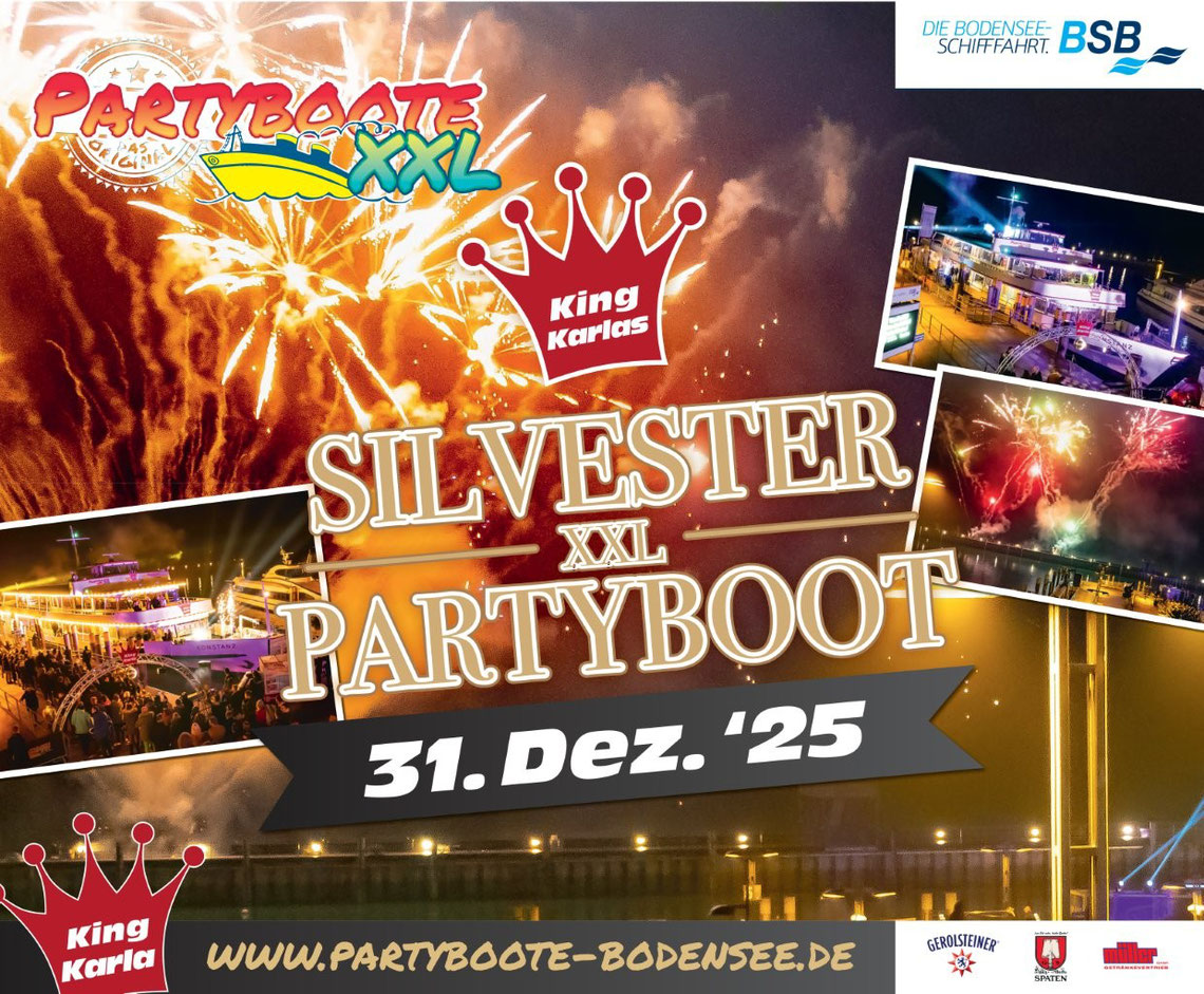 KingKarla feiert seit 2010 die besten Partyboote XXL auf dem Bodensee! Wer uns kennt, liebt uns. Darum sind unsere Partyboote auch immer so rasch ausgebucht. Unsere All-In-Tickets enthalten jede Menge guter Laune, Bier, Wein, Prosecco und alle Softdrinks in Markenqualität (ausgenommen White Summer). Hier geht es direkt in den Partyhimmel 2025 auf dem wunderschönen Bodensee! Egal ob Schlagerboot, Classic Rock-Boot, El Mallorca Boot, Schlagerloveboot, White Summer Night, Wiesn-Boot und viele weitere Mottos.